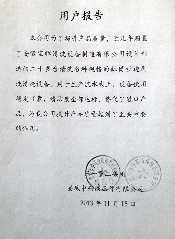 關(guān)鍵詞:用戶報(bào)告  發(fā)布日期:2015-03-05  來源:安徽寶輝清洗設(shè)備制造有限公司