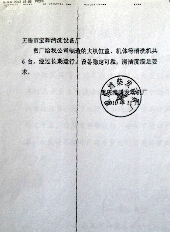 關(guān)鍵詞:重慶濰柴發(fā)動機廠用戶報告  發(fā)布日期:2015-03-05  來源:安徽寶輝清洗設(shè)備制造有限公司